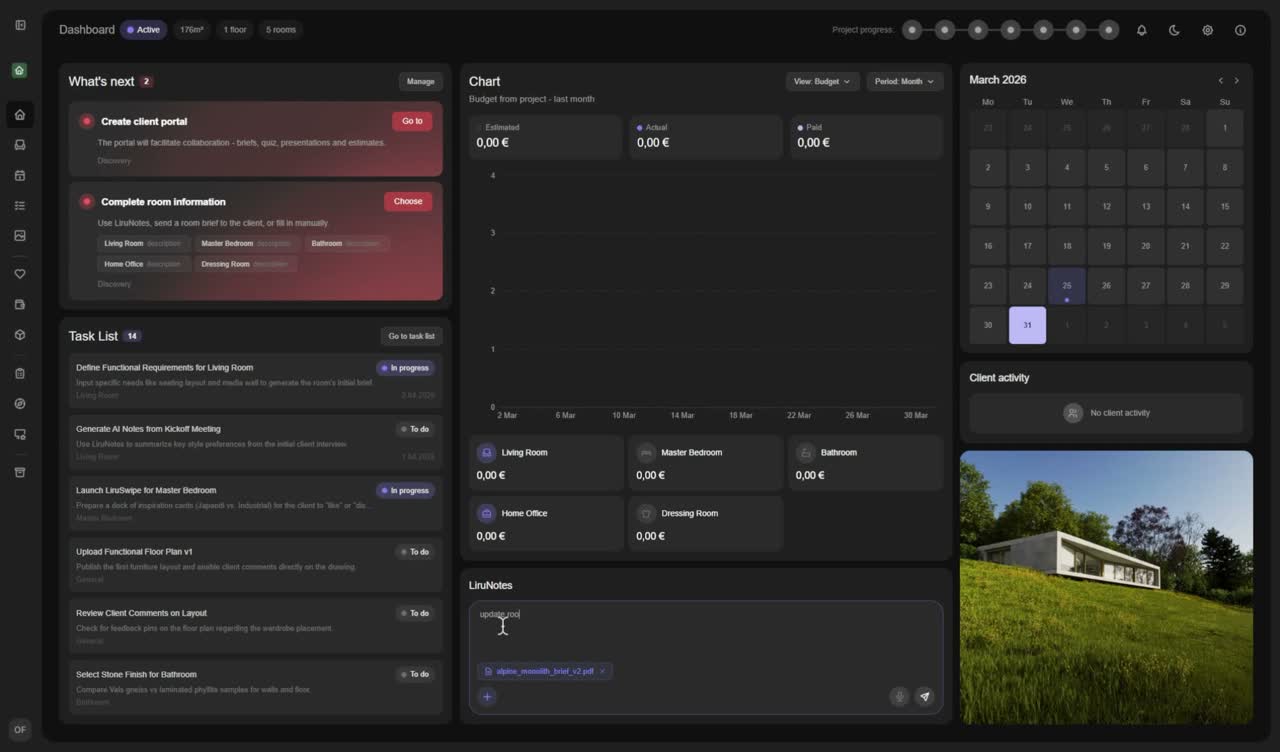 Every feature is designed around the real interior design workflow – from first client meeting to final delivery.